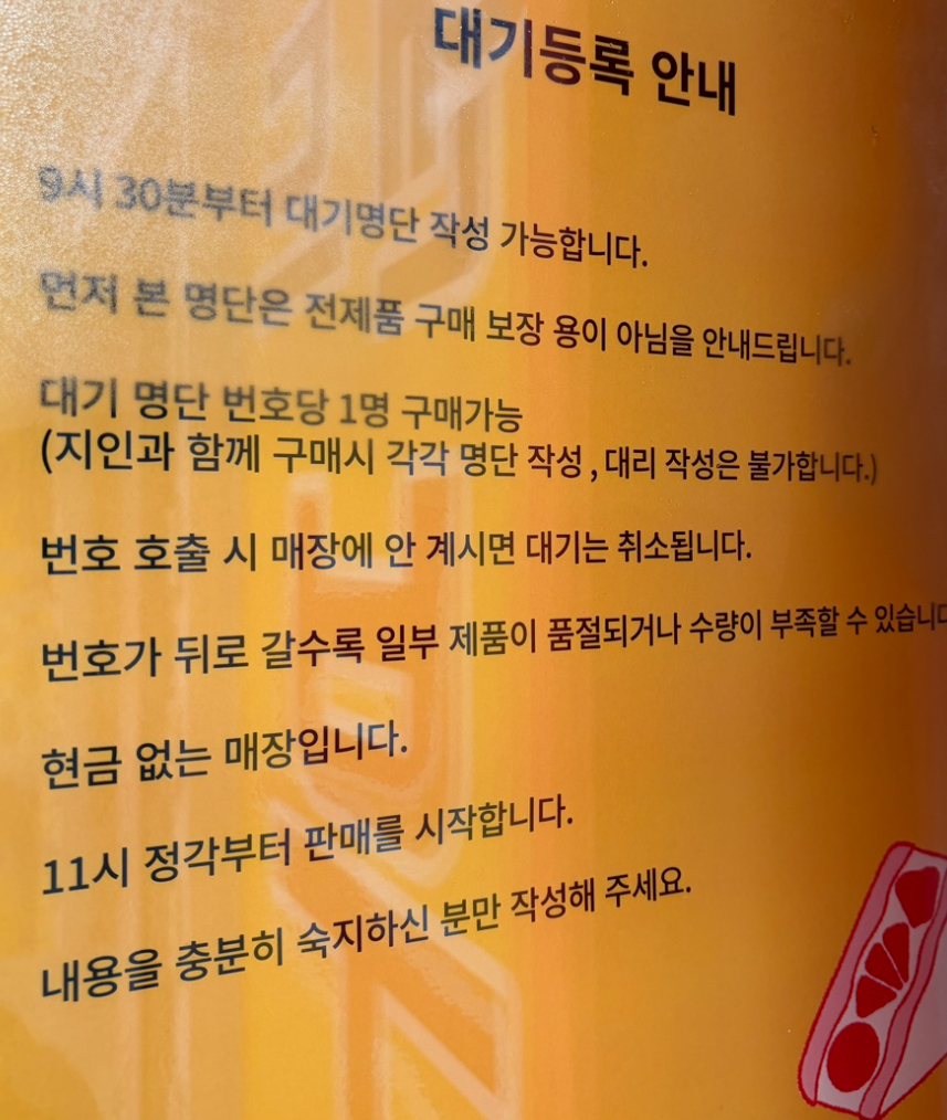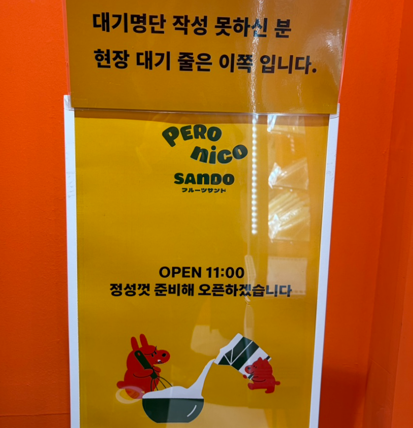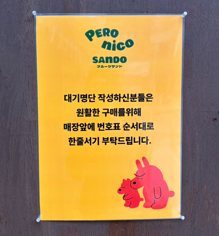 입소문이 빠르게 퍼진 만큼 주말이나 특정 시간대에는 웨이팅이 생길 수 있습니다. 특히 후르츠산도는 수량이 한정된 경우가 있어 늦은 시간 방문 시 품절 가능성도 염두에 두는 편이 좋습니다. 비교적 여유로운 방문을 원한다면 평일 낮 시간대가 편해 보였습니다.