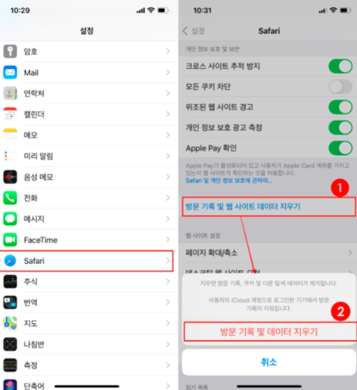 - ‘개인정보 및 보안’에서 ‘인터넷 사용 기록 삭제’를 선택합니다.