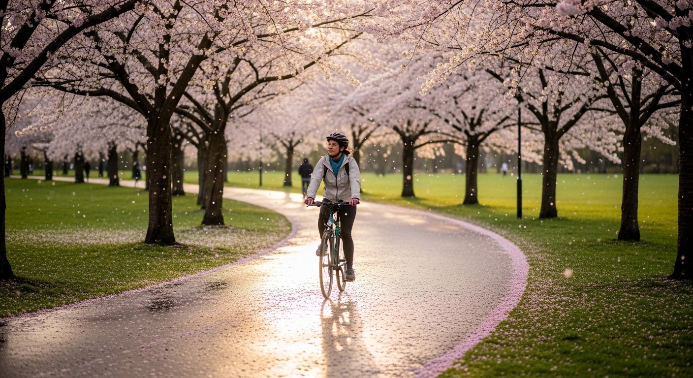 자전거를 타고 공원을 한 바퀴 돌며 벚꽃을 감상할 수 있어, 일반 산책과는 또 다른 재미를 느낄 수 있습니다. 이동하면서 다양한 풍경을 볼 수 있는 점이 매력입니다.
