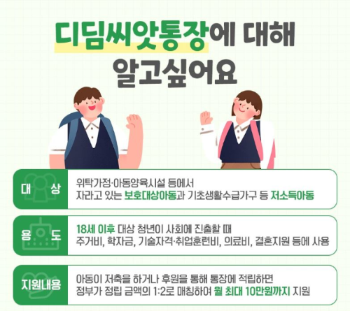 디딤씨앗통장은 아동이 일정 금액을 저축하면 정부와 지방자치단체가 동일한 금액을 추가로 지원하여 자립 준비 자금을 마련할 수 있도록 돕는 복지사업입니다. 이 자금은 아동이 성인이 된 후 학업, 취업, 주거 마련 등에 활용할 수 있습니다.