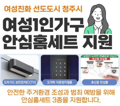 청주시는 2022년에 '청주시 1인가구 안전망 지원에 관한 조례'를 제정하여 여성 대상 범죄 예방에 힘쓰고 있습니다. 또한, 청주흥덕경찰서 및 SK쉴더스와 협업하여 보안기기 월 이용료 지원 및 할인 서비스를 제공하고 있습니다.