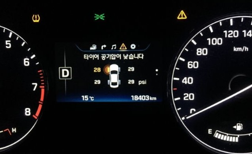 - 차량 문 안쪽 또는 차량 매뉴얼에서 적정 타이어 공기압 수치 확인