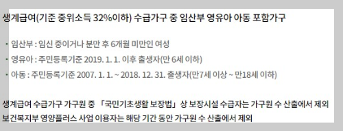 - 생계급여 수급 가구 중 임산부, 영유아, 만 18세 이하 아동이 포함된 가구