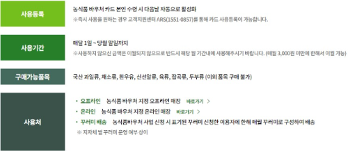 - 전화 신청: 농식품바우처 고객지원센터(☎ 1551-0857)를 통해 신청