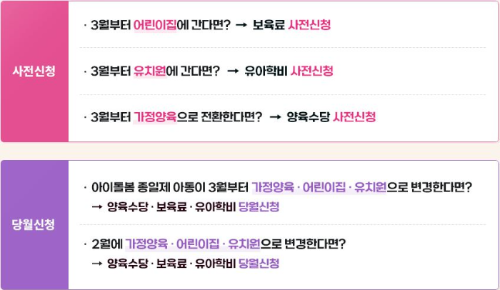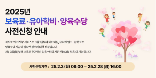 사전신청은 2025년 3월부터 어린이집, 유치원에 다니거나 가정양육을 선택하는 경우, 2월에 미리 신청하여 3월부터 바로 지원을 받을 수 있도록 하는 제도입니다. 이를 통해 지원 공백 없이 혜택을 누릴 수 있습니다.
