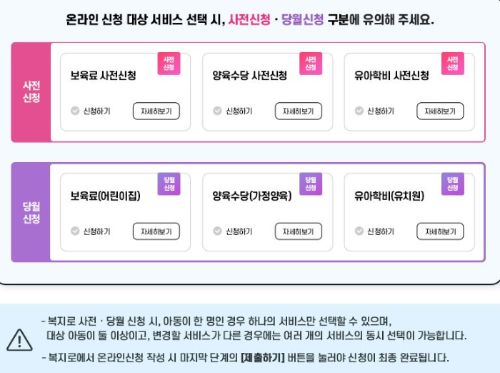 또한, 한 자녀당 하나의 서비스만 선택 가능하므로, 여러 자녀가 각각 다른 서비스를 신청할 경우 각각 따로 신청해야 합니다. 신청 완료 후에는 반드시 '제출하기' 버튼을 눌러야 신청이 완료됩니다.